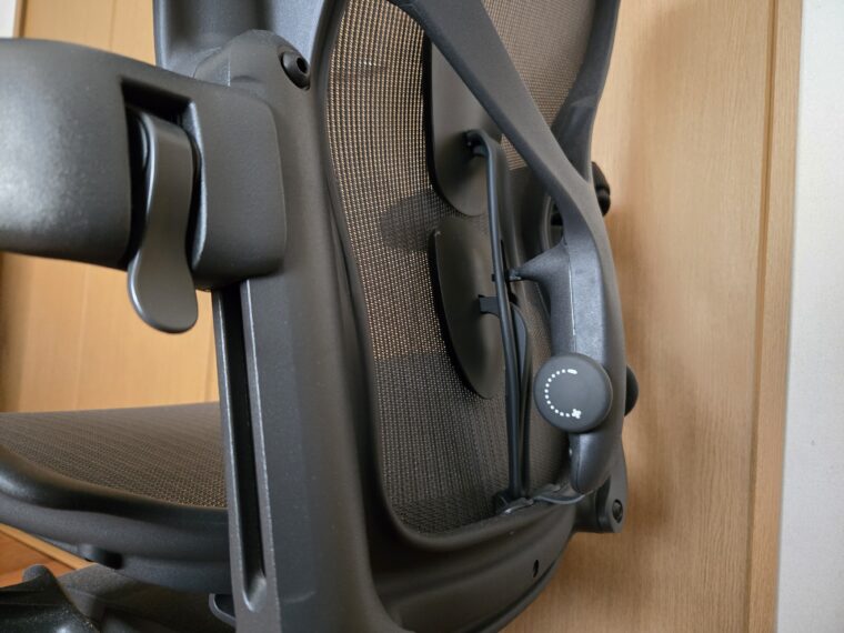 背中を支えるパーツが背面にあり、腰を後ろからサポートしてくれます。サポートの押し出し具合は微調整が可能で、自分が心地良いと思える張り出し具合に設定にできます。